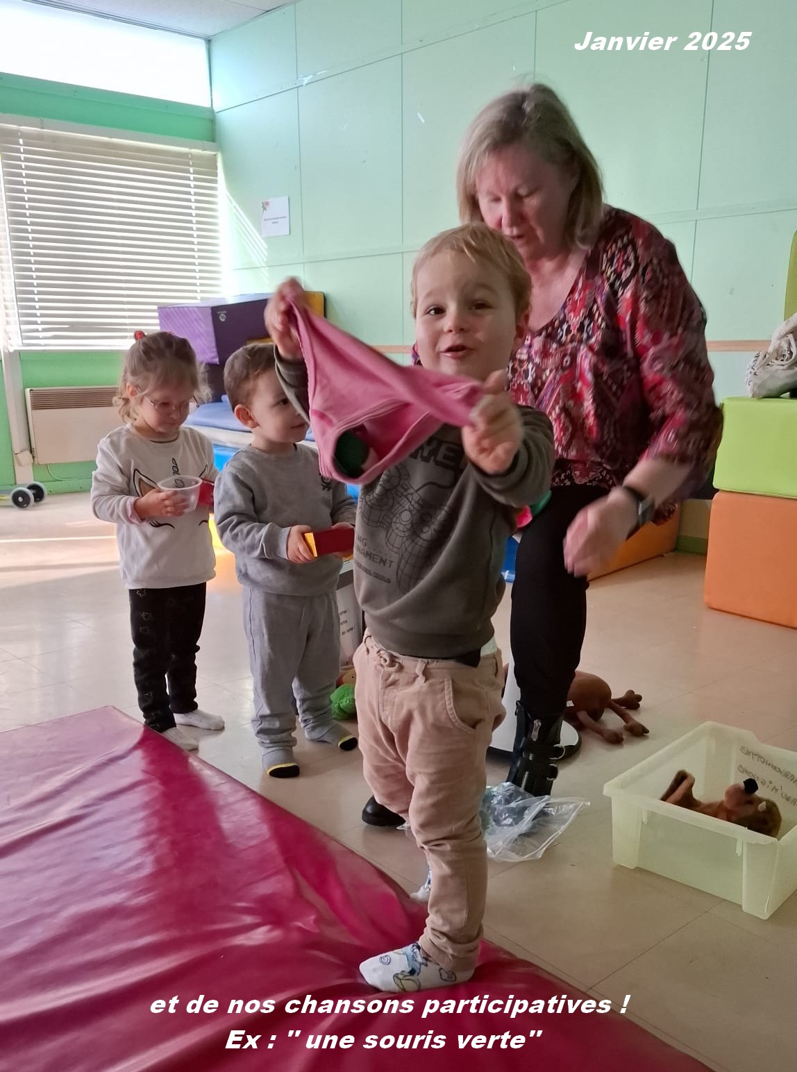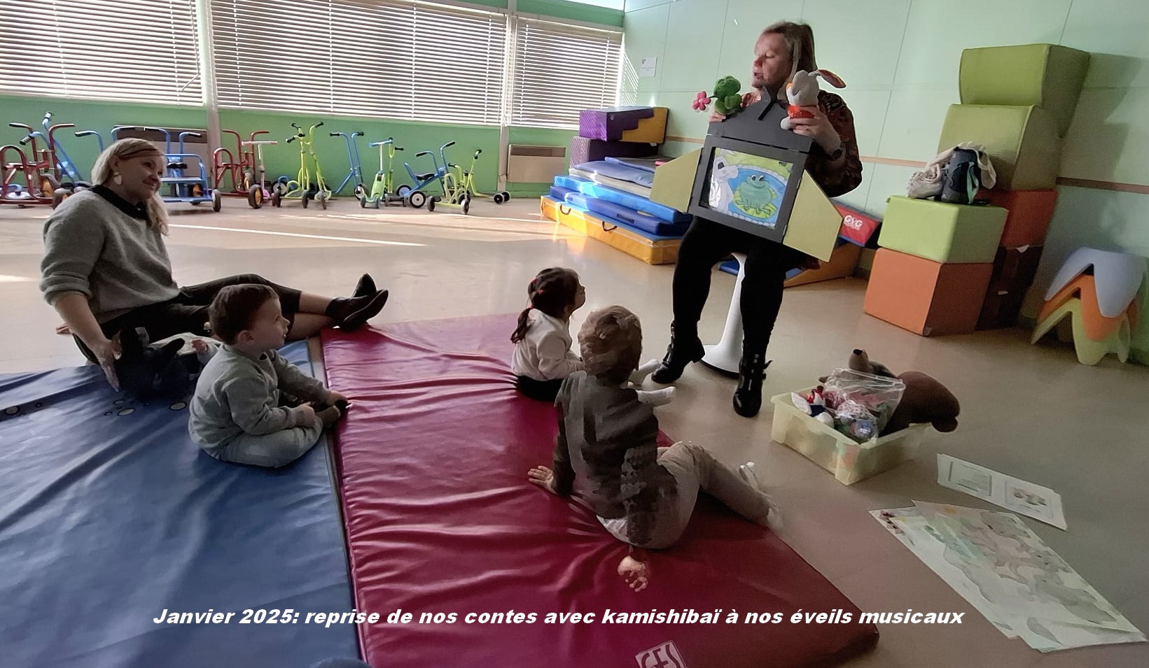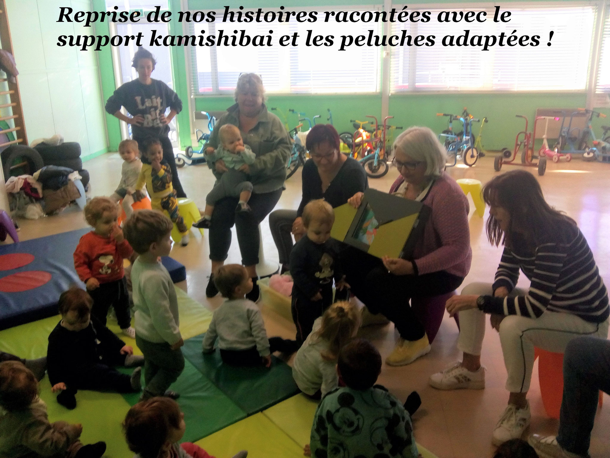 *Chansons à gestes et comptines choisies par les enfants avec nos supports peluches mais aussi petites histoires créées et imagées avec le Kamishibaï, rondes et danses, animent nos séances hebdomadaires grâce aux compétences partagées et au dévouement collectif et ce pour le plus grand bonheur des petits Crau'mignons !